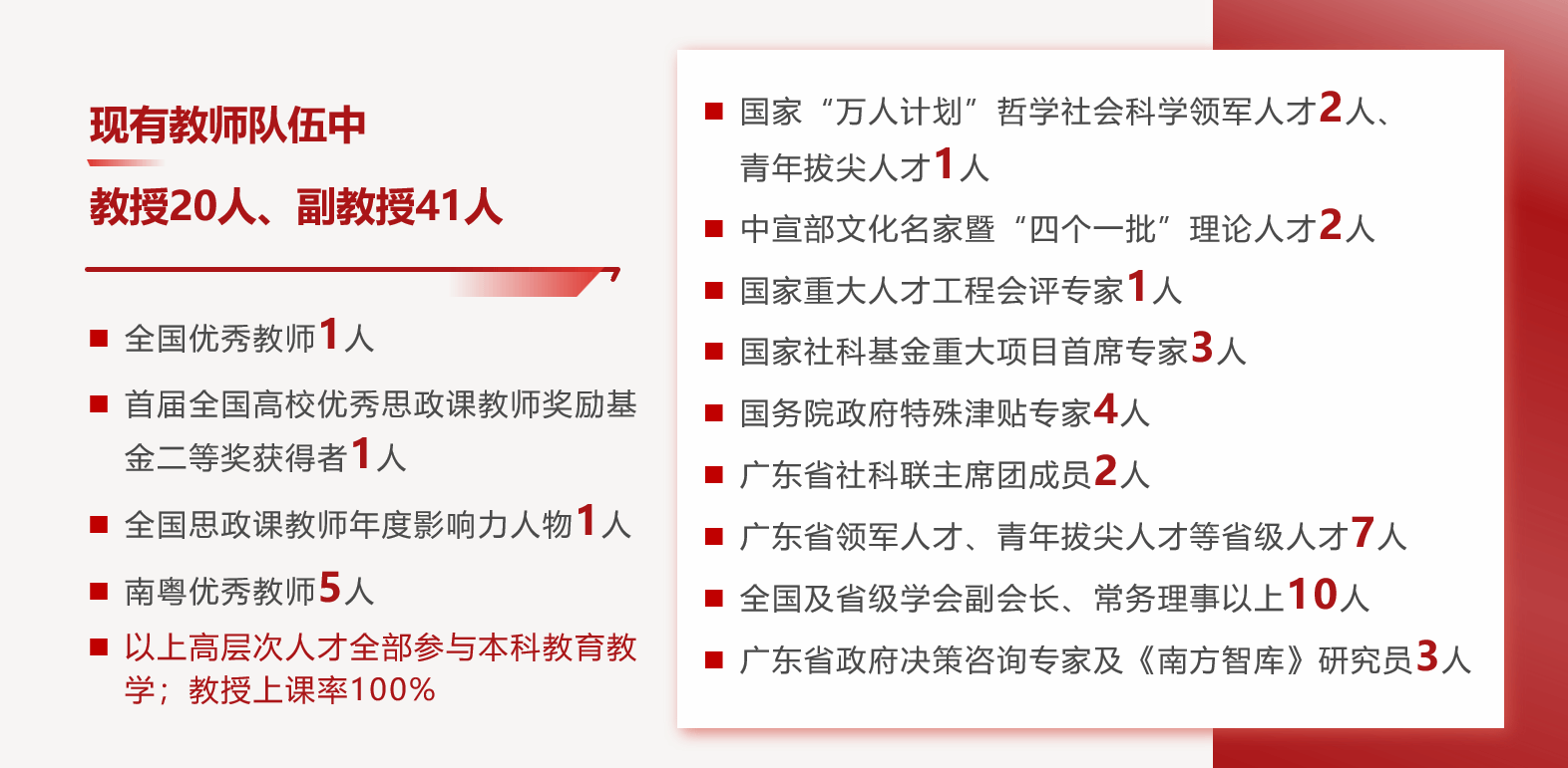 。学院拥有一支有影响力的教师队伍,现有全国优秀教师1人、首届全国高校优秀思政课教师奖励基金二等奖获得者1人、全国思政课教师年度影响力人物1人、南粤优秀教师5人;现有国家高层次人才“特殊支持计划”哲学社会科学领军人才2人、青年拔尖人才1人,中宣部文化名家暨“四个一批”理论人才2人、国家重大人才工程会评专家1人、国家社科基金重大项目首席专家3人、国务院政府特殊津贴专家4人、广东省社科联主席团成员2人,广东省领军人才、青年拔尖人才等省级人才7人,全国及省级学会副会长、常务理事以上10人。以上高层次人才全部参与本科教育教学;教授上课率100%。