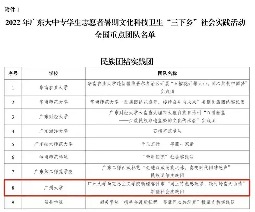 民族团结实践团获评为2022年广东大中专学生志愿者暑期文化科技卫生“三下乡”社会实践活动全国重点团队。