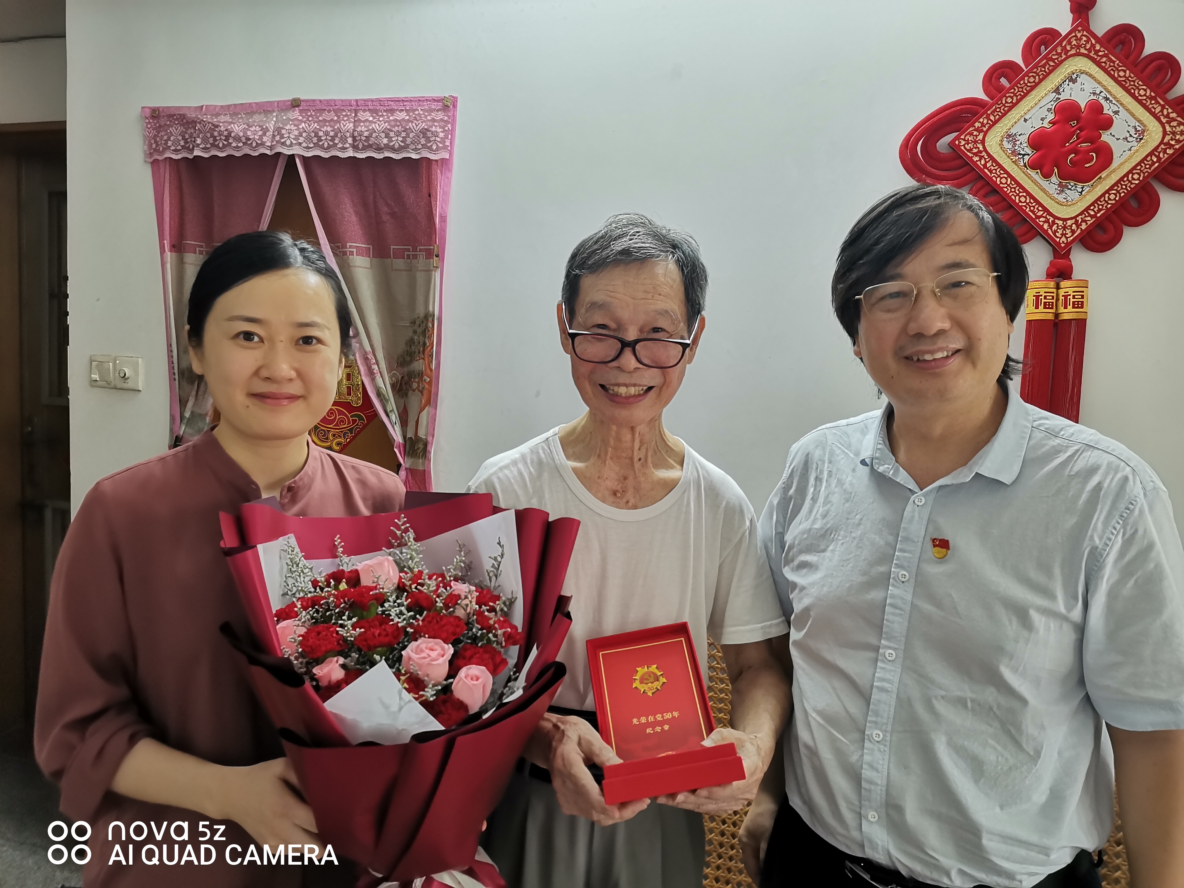 党的百年华诞来临之际,2021年6月30日上午,学院党委书记罗明星同志、党委副书记梅淑宁同志、行政党支部书记蔡怡青同志来到退休老党员家中,为退休党员教师吴武、余娉影、刘汝权颁发“光荣在党50年”纪念章和政治生日贺卡。