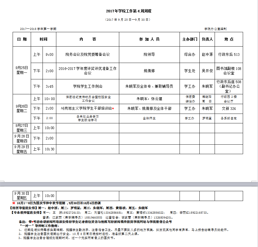 2017年学院工作第4周周程