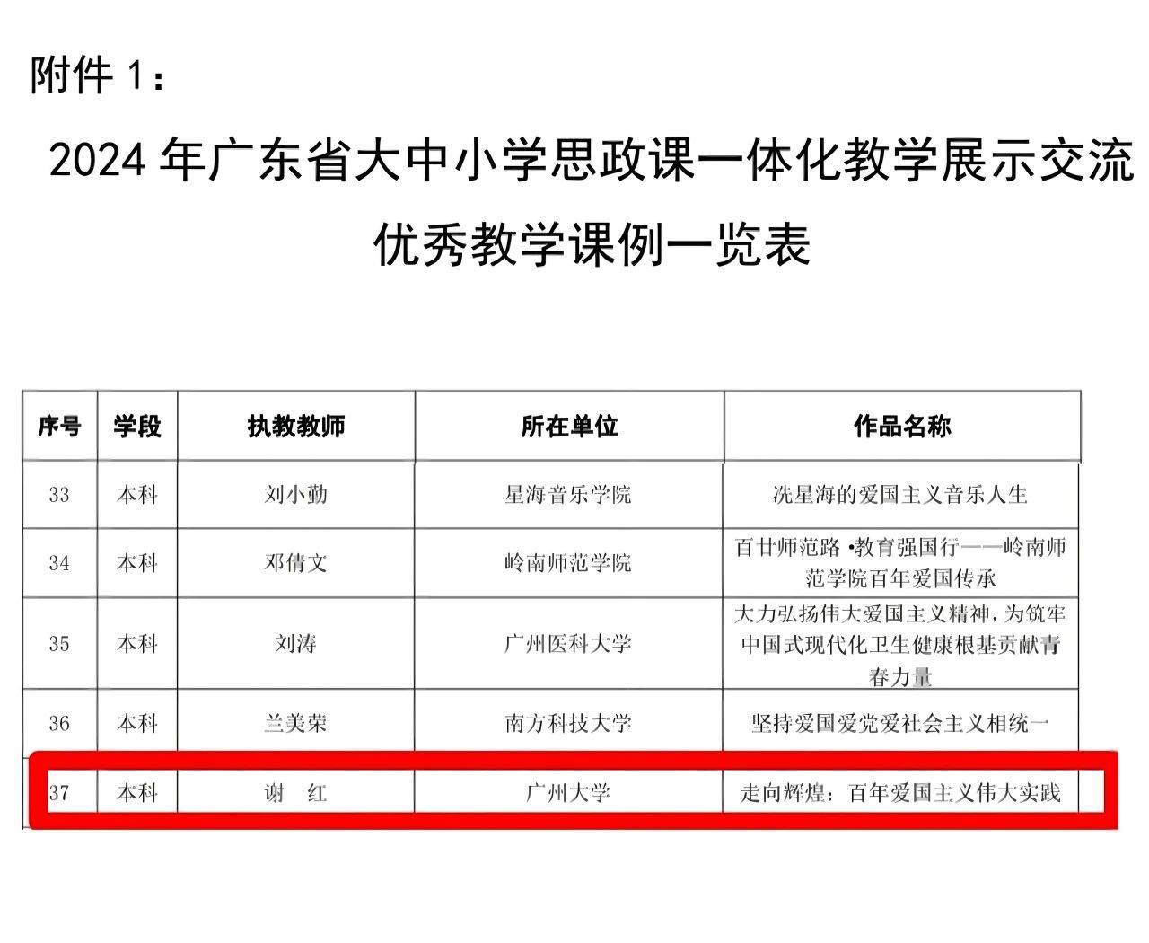 日前,广东省教育厅发文公布了2024年广东省大中小学思政课一体化建设展示交流活动优秀成果,由谢红副教授申报的课例《走向辉煌:百年爱国主义伟大实践》获评优秀教学课例二等奖。这是谢红副教授继2024年6月获评“南粤优质思政课例”后的又一省级教学奖。