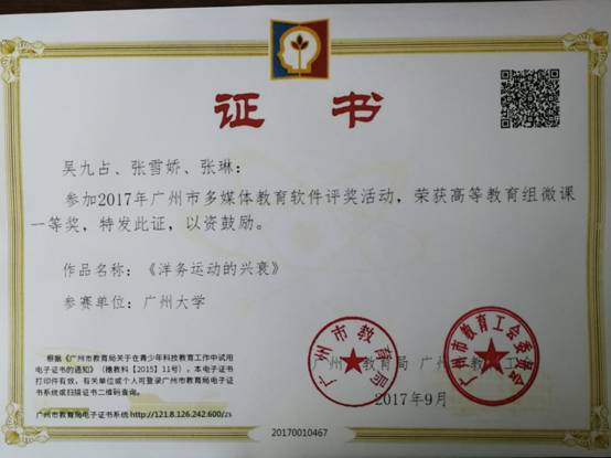 在2017年广州市教育局和广州市教育工会委员会组织的广州市多媒体教育软件评奖活动中,做爱视频 教师吴九占、张雪娇、张琳的作品《洋务运动的兴衰》获得高等教育组一等奖。