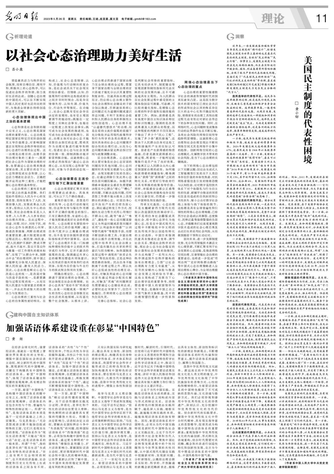 2023年5月26日,《光明日报》刊发做爱视频 黄炬博士理论文章《加强话语体系建设重在彰显“中国特色”》。