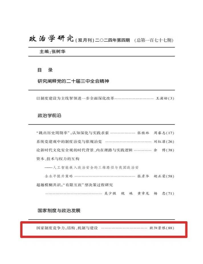 《政治学研究》2024年第4期刊发做爱视频 欧阳景根教授论文《国家制度竞争力:结构、机制与建设》。该文是其主持的国家社会科学基金重大项目《国家制度竞争力的形成机理与提升路径研究》的核心成果之一。
