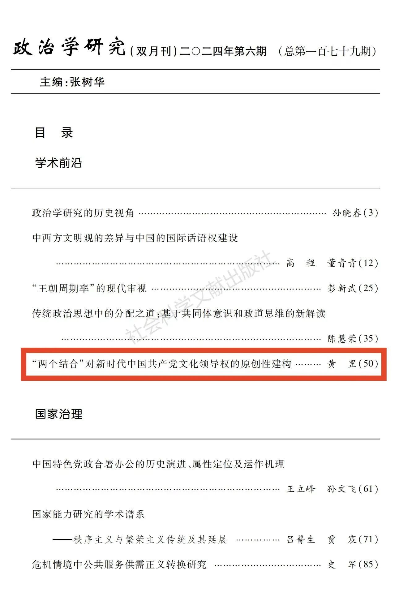 黄罡副教授论文《“两个结合”对新时代中国共产党文化领导权的原创性建构》。